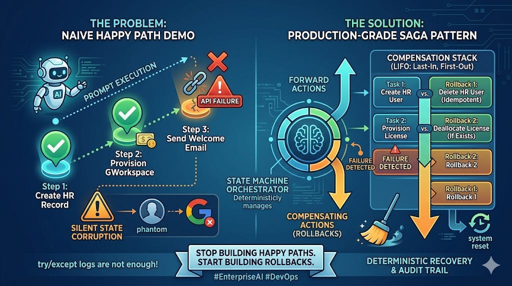 We cannot let a probabilistic model leave our deterministic enterprise infrastructure in a fundamentally corrupted state just because it got confused on Step 4 of a 10-step prompt. We must move beyond “it worked on my machine” demos and adopt a core distributed systems engineering paradigm: Transactions and Rollbacks.