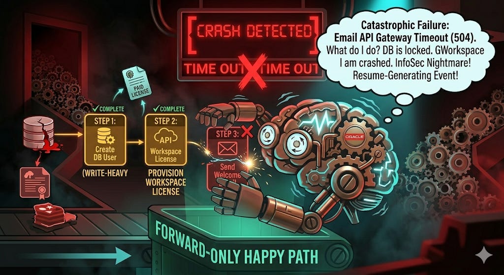When your agent manipulates internal state (e.g., creating a DB entry) and external state (e.g., provisioning a paid external license), it is participating in a distributed system. And distributed systems are brittle. They time out. APIs fail. Edge cases appear.